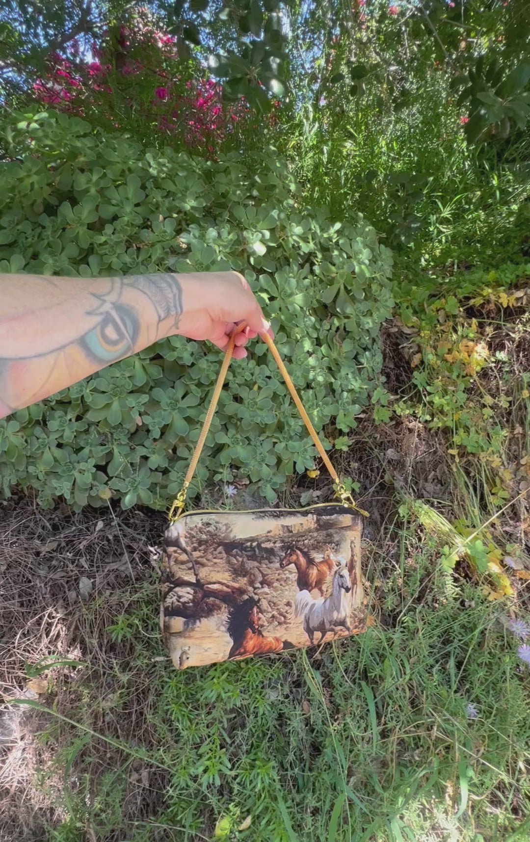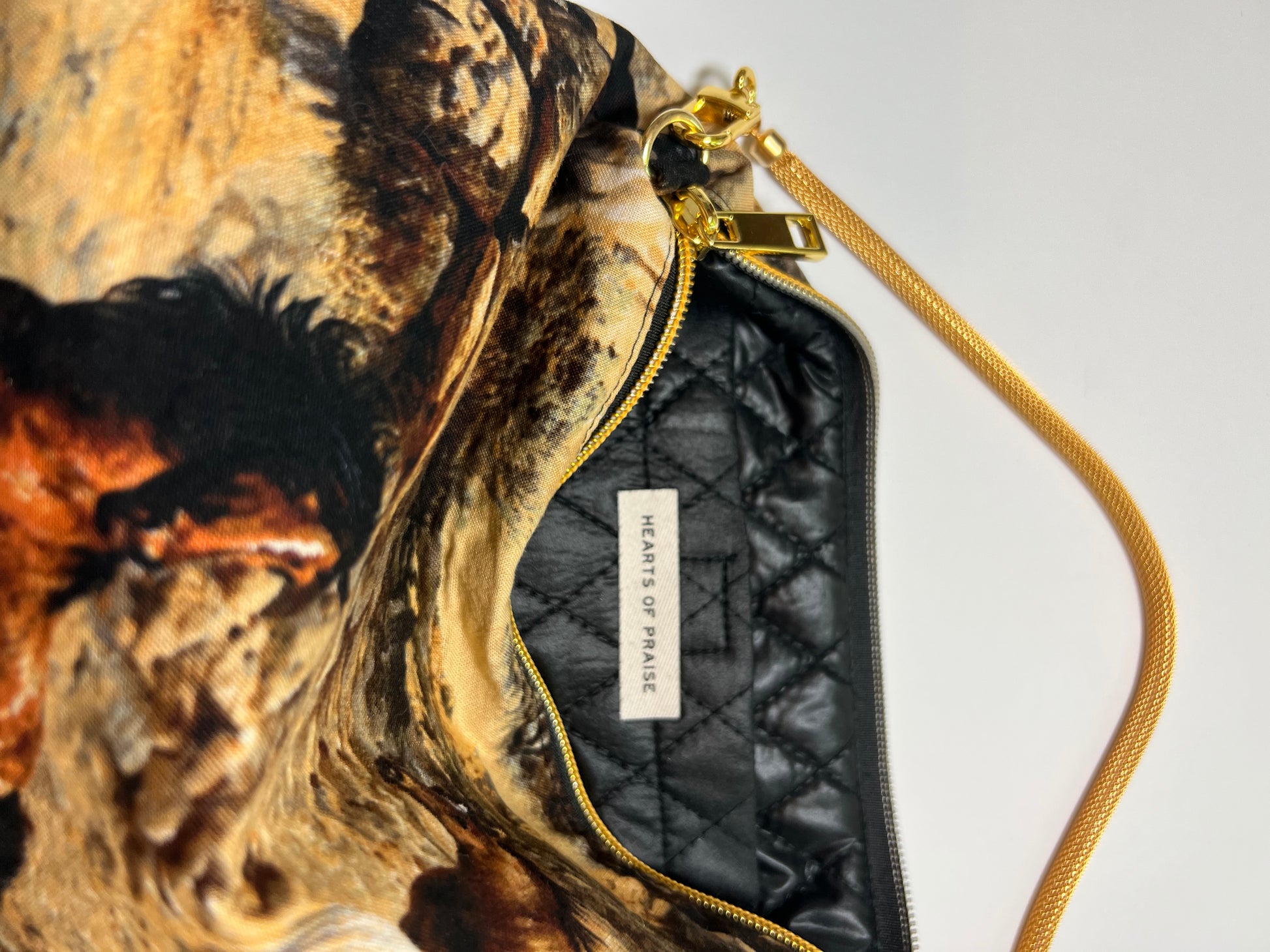 Horse print handbag with removable gold shoulder strap